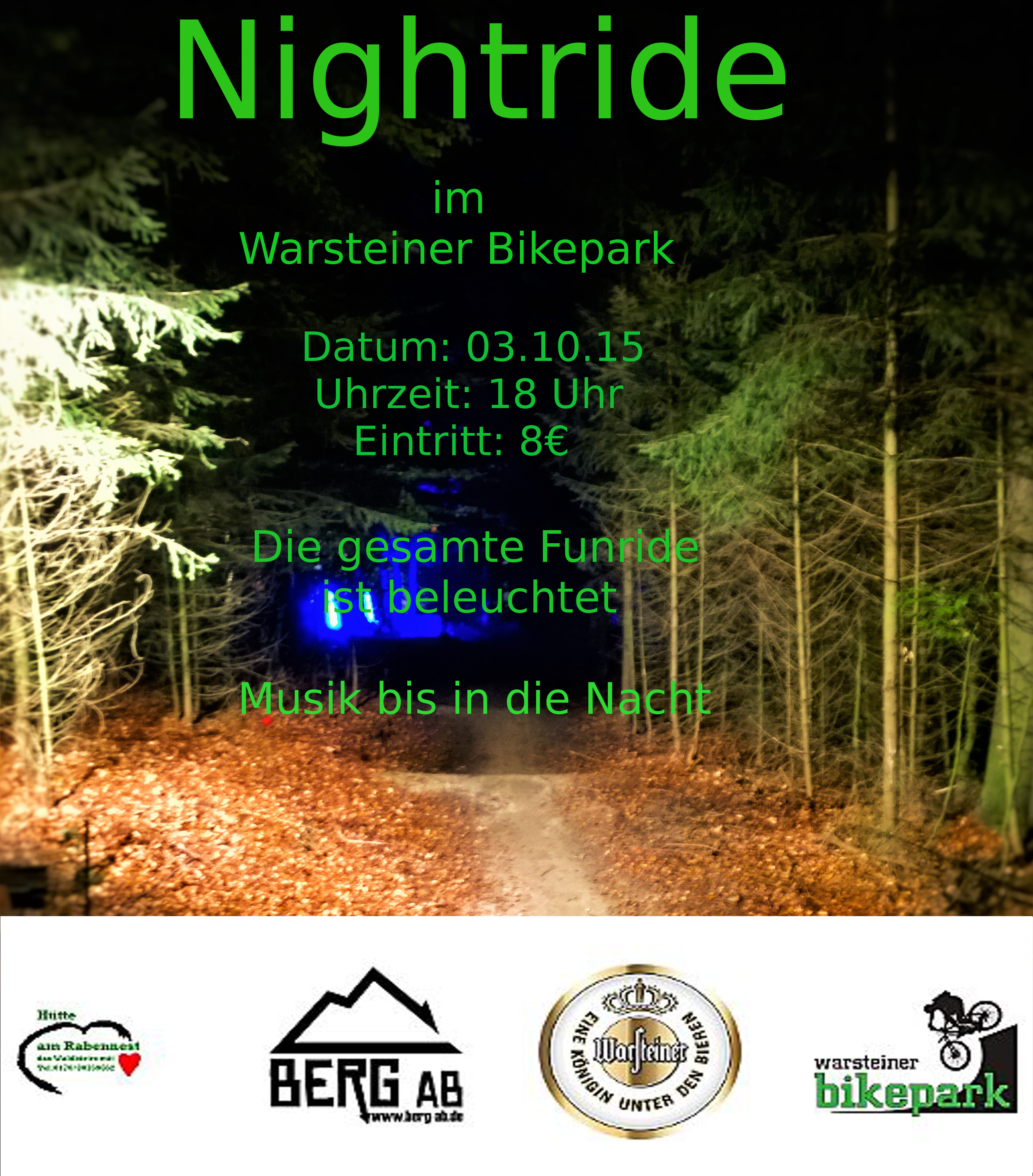 Wir laden euch herzlich zum 2ten Nightride im Warsteiner Bikepark ein. Los gehts am 3.10 um 18 Uhr und der Eintritt beträgt 8€. Wir hoffen auf gutes Wetter und eine rege Teilnahme. Helmlampen sind wünschenswert, denn mit Helmlampe dürfen auch die unbeleuchteten Strecken befahren werden. LG die Kaiser